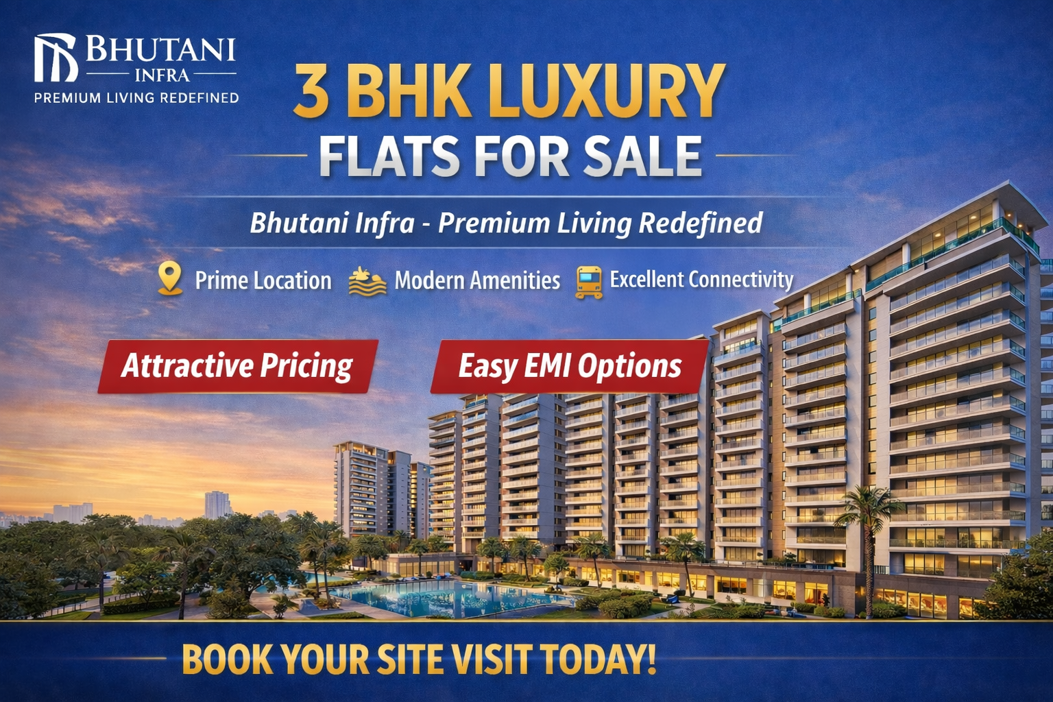 Bhutani Infra at Sigma 3, Greater Noida is a premium residential project by Bhutani Properties featuring thoughtfully designed 3 BHK apartments with modern layouts and abundant natural light. It spans around 9–9.6 acres with multiple high-rise towers and offers a host of world-class amenities like a clubhouse, swimming pool, landscaped gardens, jogging tracks, and children’s play zones for a holistic lifestyle. The development emphasizes sustainable living with features such as rainwater harvesting, solar power provisions, and EV charging stations.